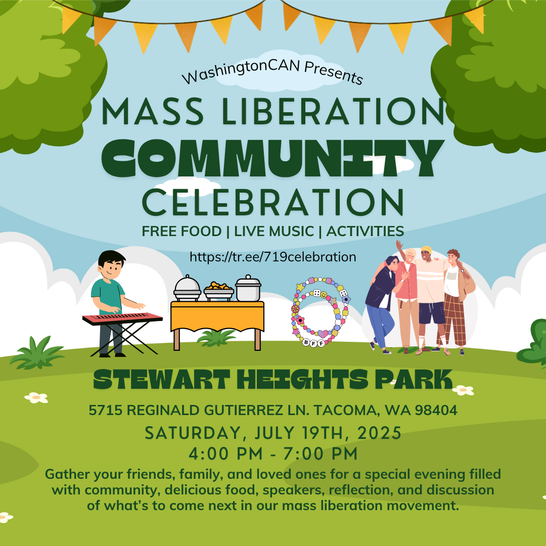 Join us in Tacoma, where our Mass Liberation movement began! We're coming together to celebrate a huge win expanding the Washington Clemency & Pardons Board to include community voices. There will be food, community, story-sharing, and a vision for what's next.