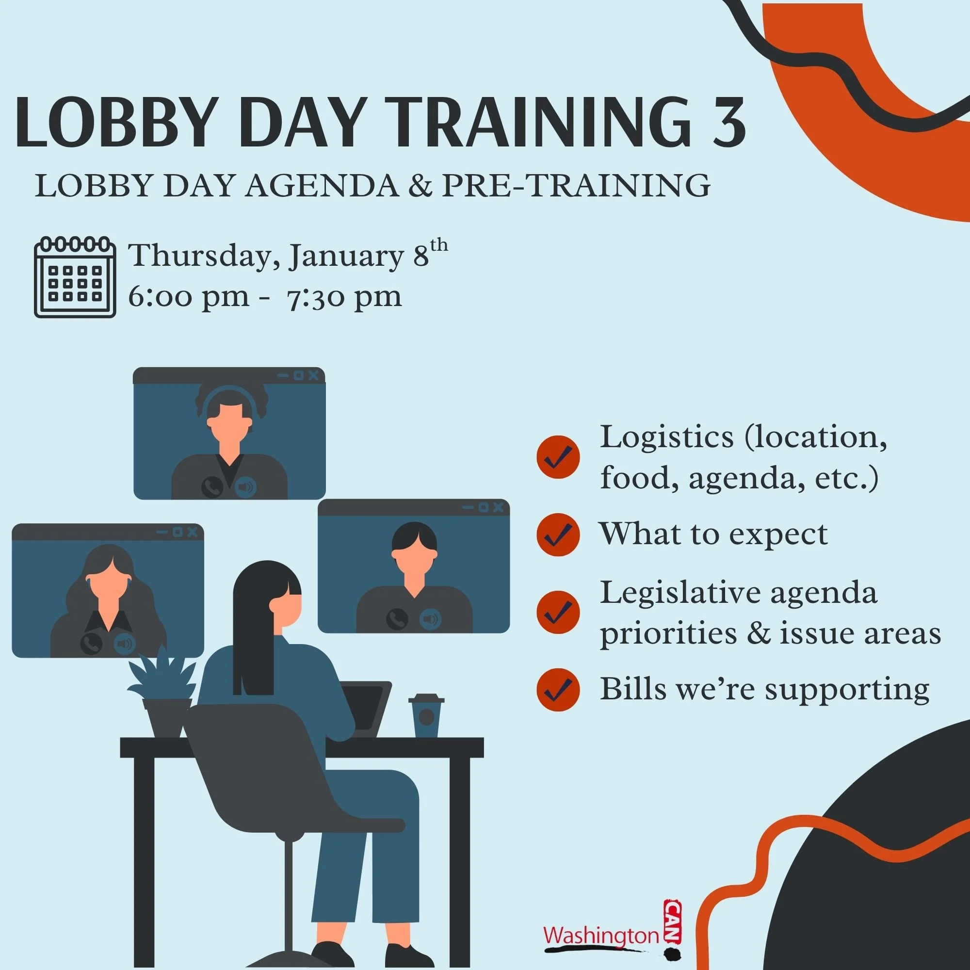All those attending 2026 Lobby Day are strongly encouraged to join us at this final training! During this session, we will go over Lobby Day logistics: location, food, agenda, activities, and more. You will learn what to expect at lobby day, what bills we’re supporting and why, as well as what you need in order to fully prepare to participate throughout the day! We hope to see you there!